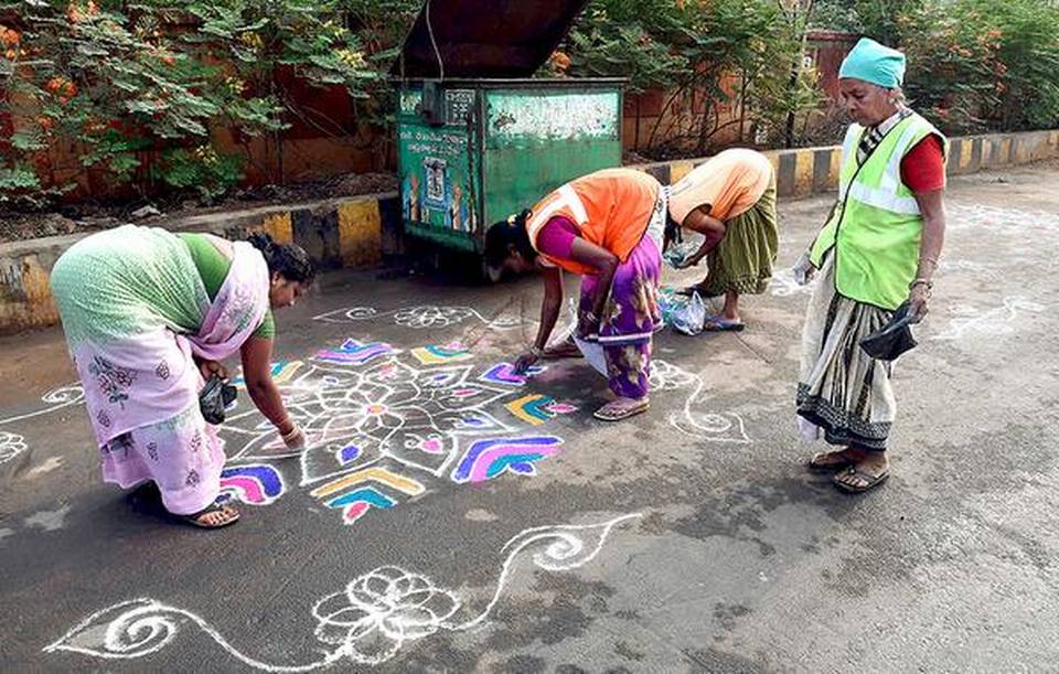 On Tuesday, sanitary workers drew colourful rangolis on the road at vulnerable areas in Thatichetlapalem area of Zone I.